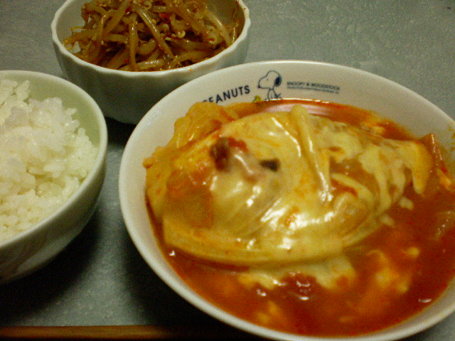 キャベツと豚肉のミルフィーユ風なんたらっていうトマト煮込みともやしのナムル。