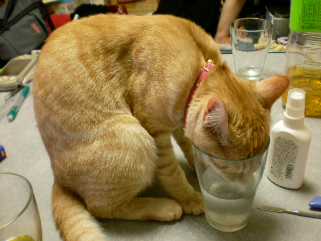 このぬこさま、自分の皿からよりもコップから飲むお水の方が好きだそうです(笑)。